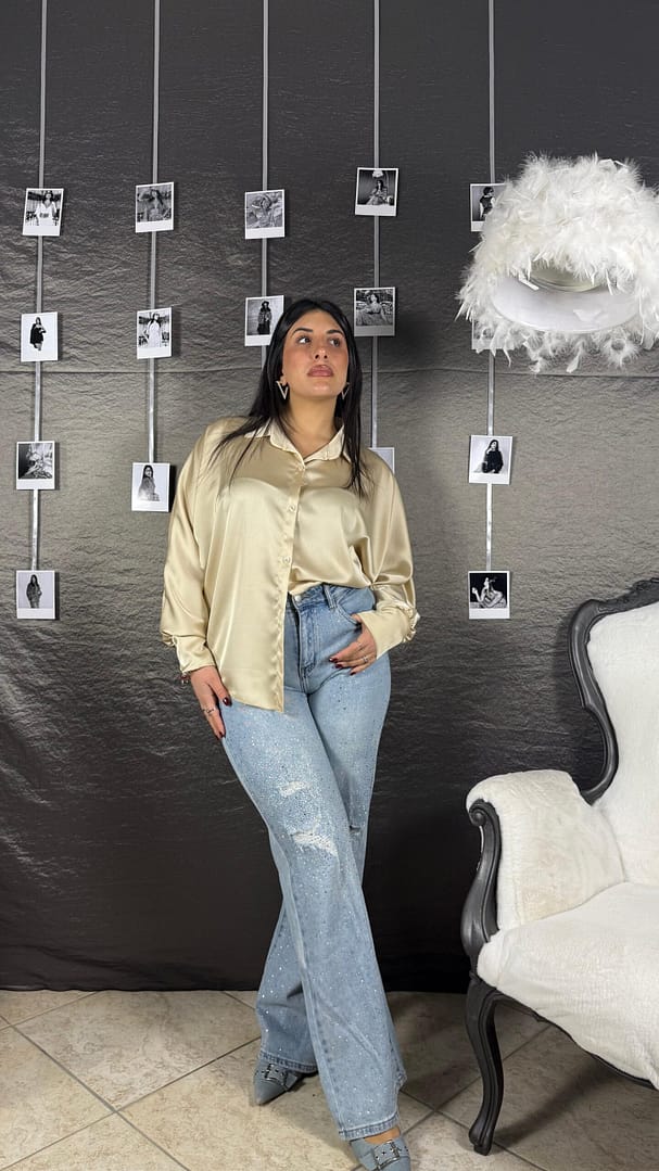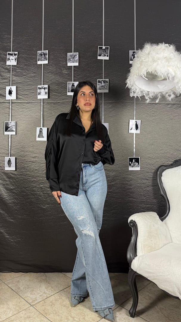 Camicia effetto raso con bottoni e manica ad ala, vestibilità 36/46.Informazioni aggiuntive