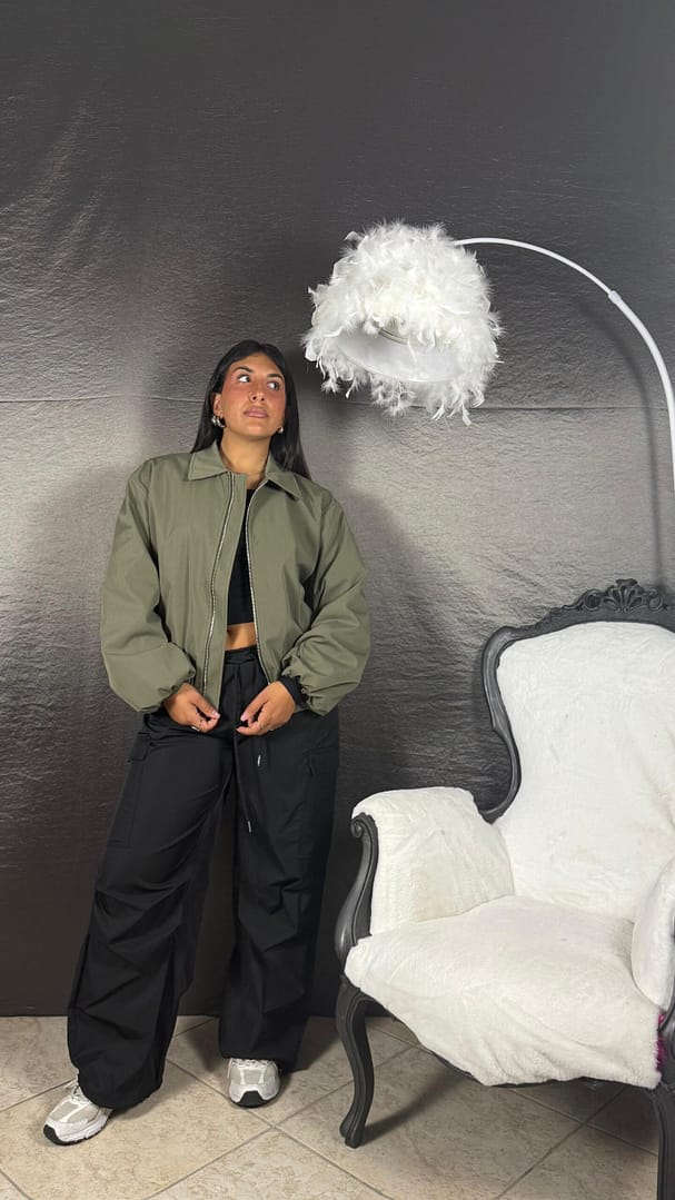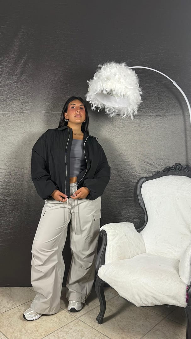 Bomber antivento con scollo polo e zip, vestibilità 36/46.Informazioni aggiuntive