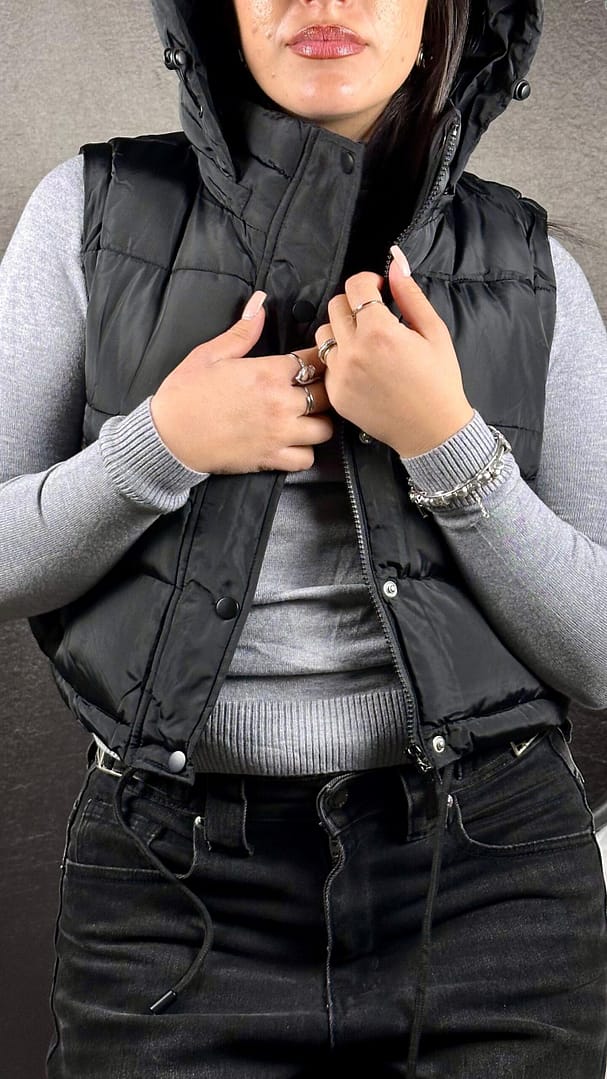 Bomber in piumino con maniche e cappuccio rimovibili, vestibilità S 36/40, M 40/42, L 42/44, XL 44/46, XXL 46/48.
