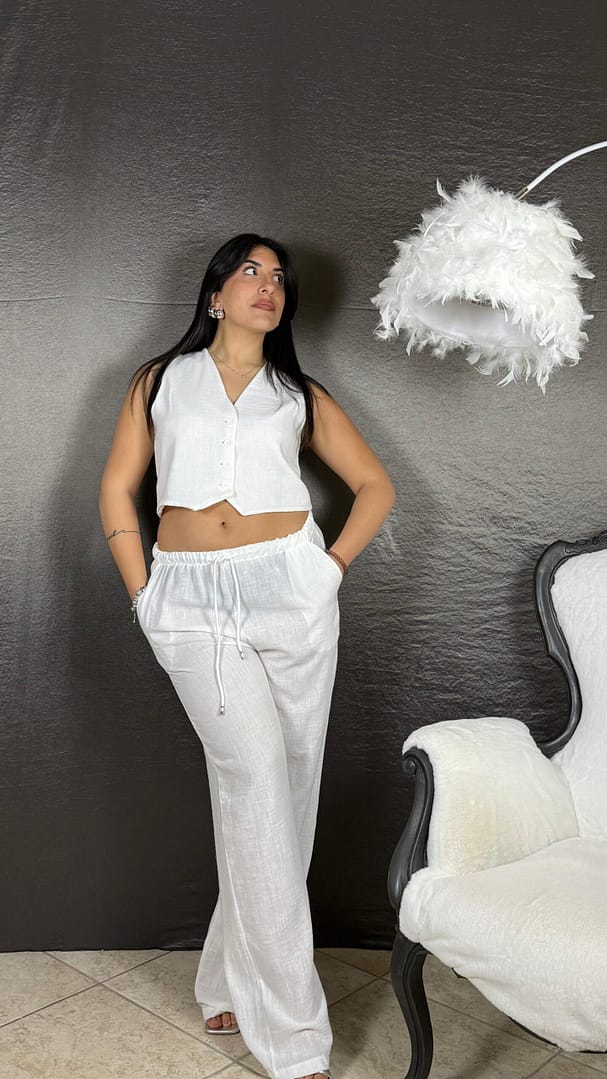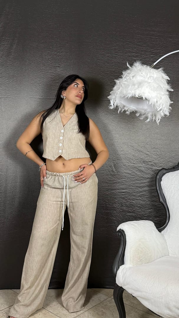 Coordset Gilet lino composto da pantalone palazzo con coulisse e gilet, vestibilità 36/46.