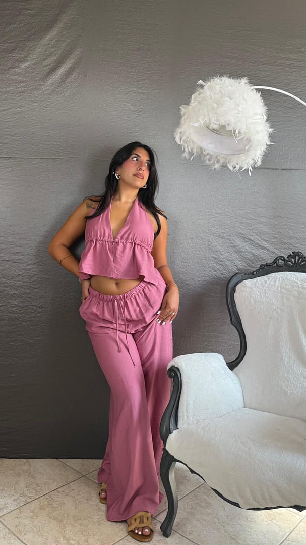 Coordinato composto da pantalone palazzo con coulisse e top con coppe e lacci, vestibilità 36/46.