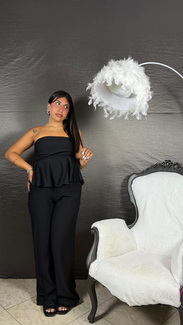 Coordinato composto da pantalone gamba dritta e top a fascia con volant in simil lino, vestibilità 36/46.Informazioni aggiuntive