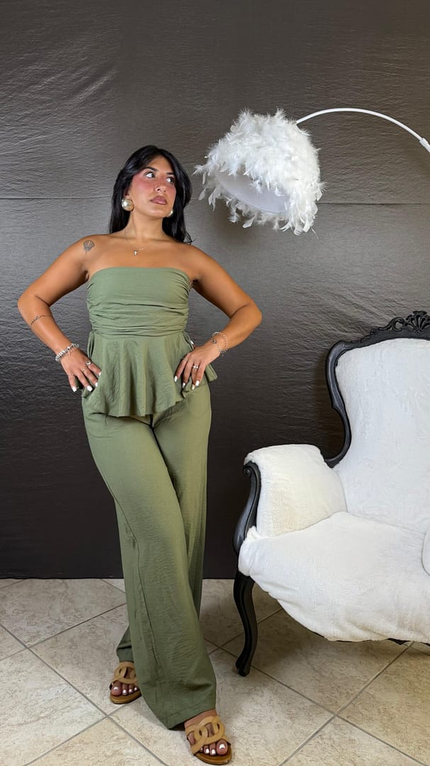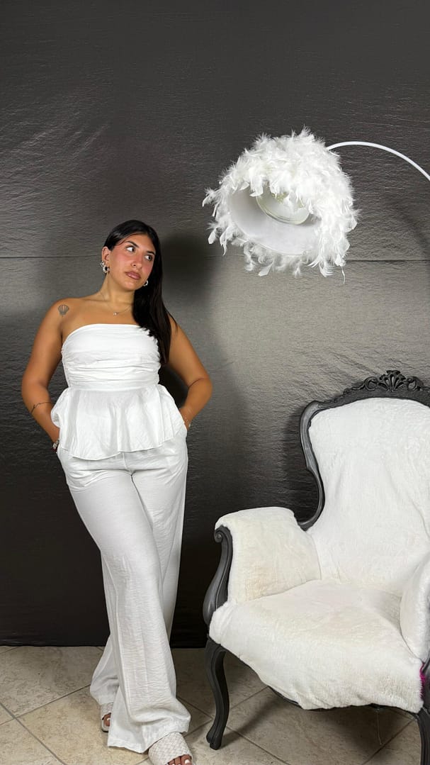 Coordinato composto da pantalone gamba dritta e top a fascia con volant in simil lino, vestibilità 36/46.