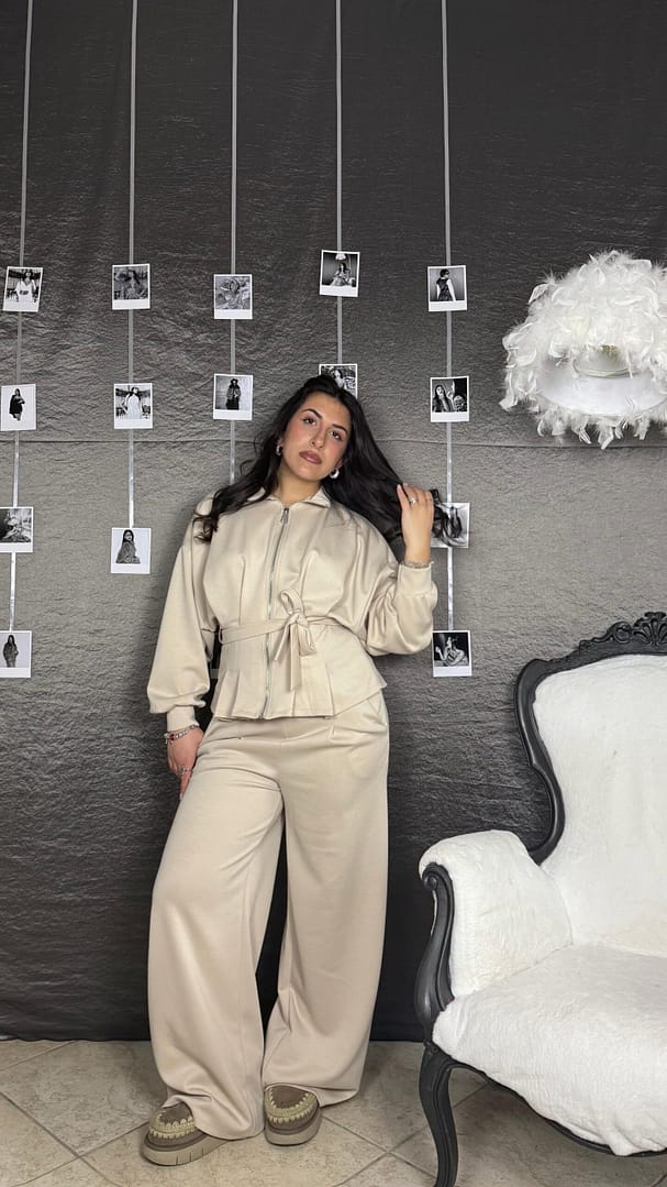 Coordinato composto da pantalone palazzo e felpa con zip, volant e cintura, vestibilità 36/46.