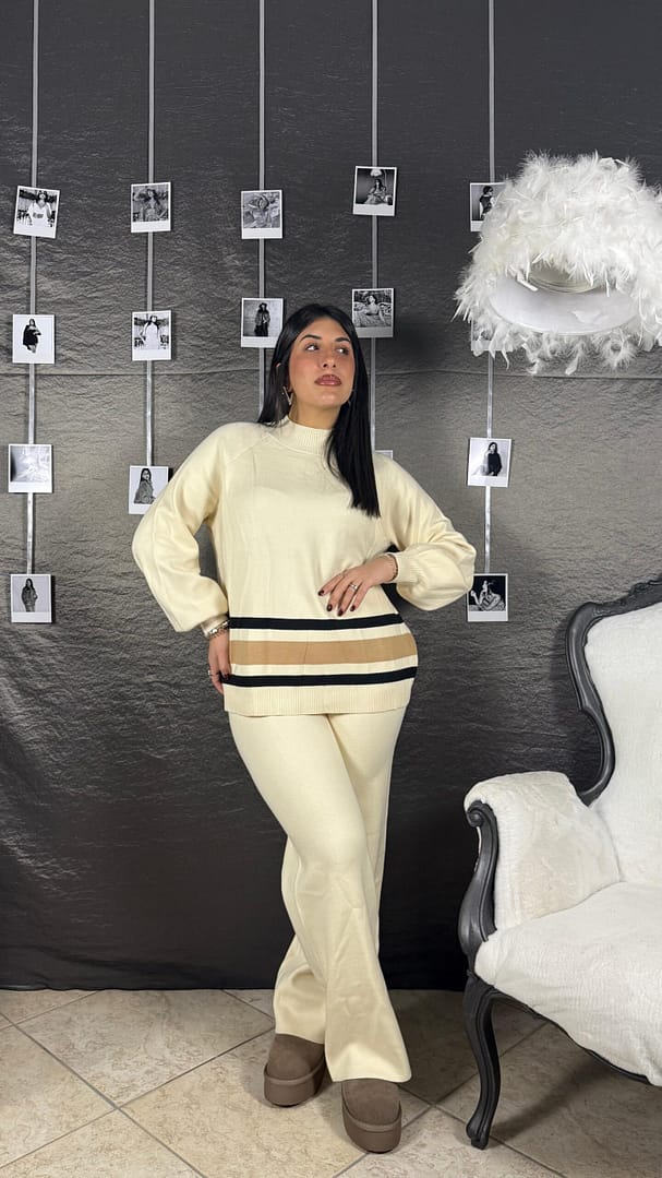 Coordinato in viscosa composto da pantalone gamba dritta e maglia over mezzocollo con righe, vestibilità 36/46.