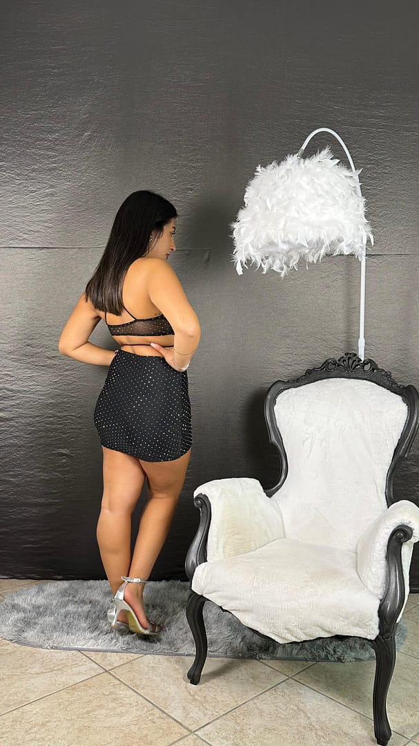 Abitino in lycra tempestato di strass con dettagli cutout e volant in shiffon, vestibilità 36/44.