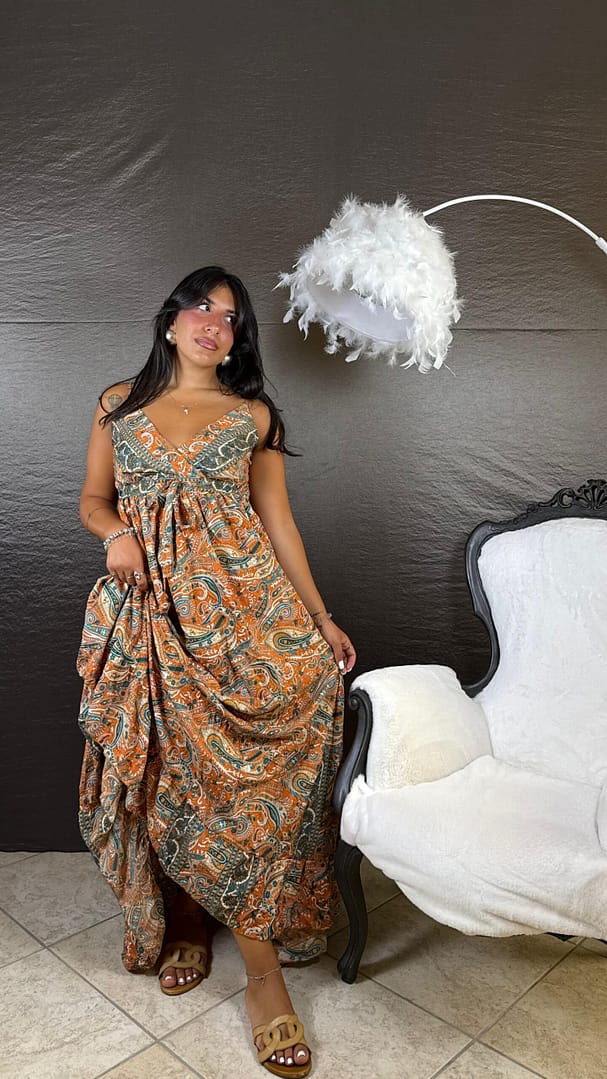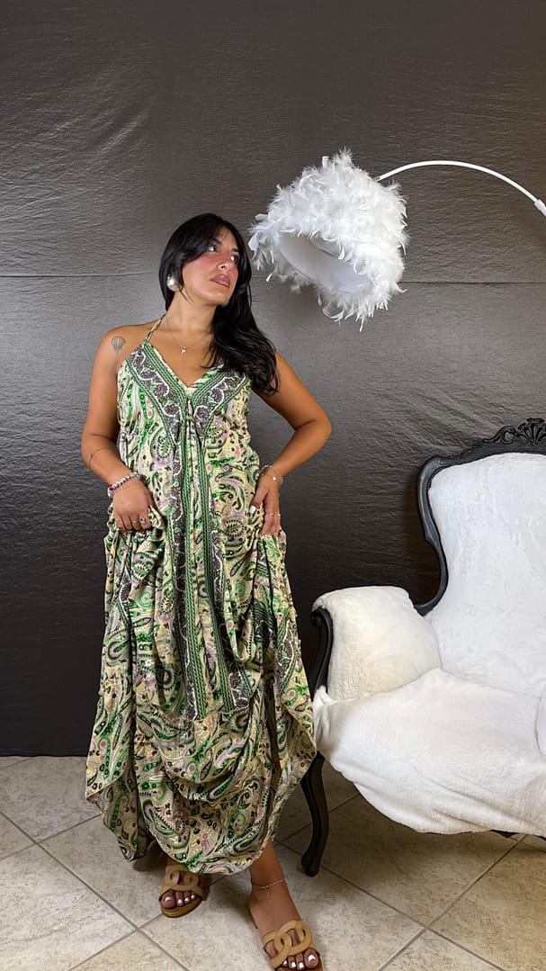 Abito lungo in raso fantasia indiana con scollo sul retro e lacci, vestibilità 36/46.Informazioni aggiuntive