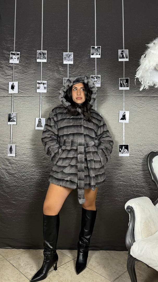 Ecopelliccia con cintura e bottone gioiello, vestibilità 36/46.