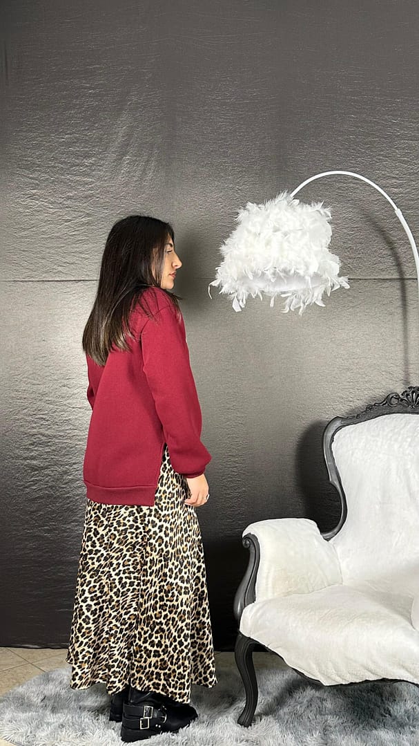 Felpa over con stampa, pile all’interno, vestibilità 36/46.