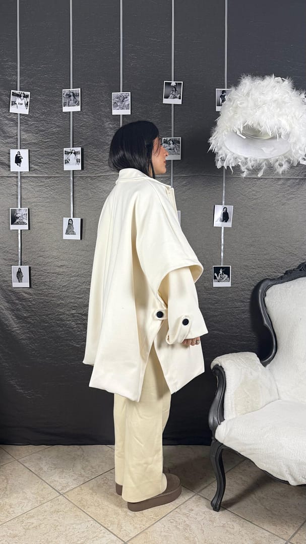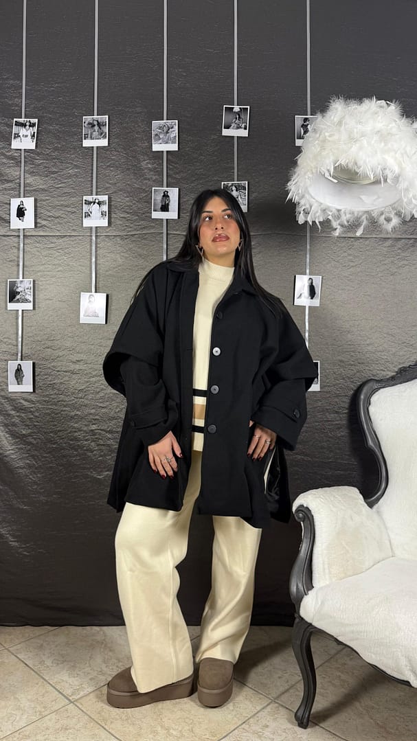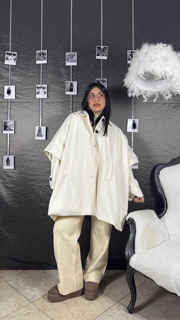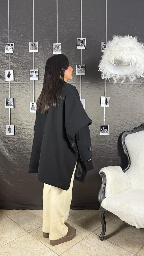 Cappotto modello cappa con aperture laterali, vestibilità 36/56.Informazioni aggiuntive