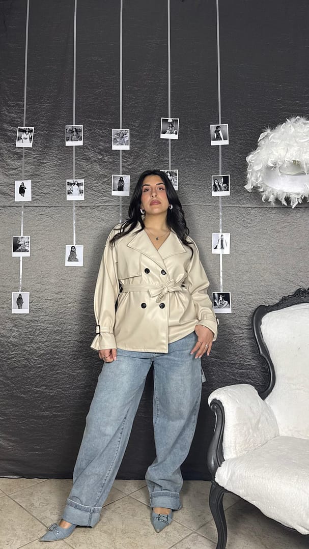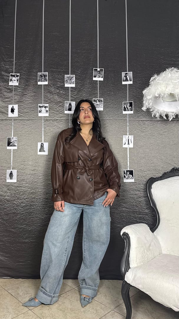 Trench corto in ecopelle con cintura e bottoni, vestibilità 36/46.
